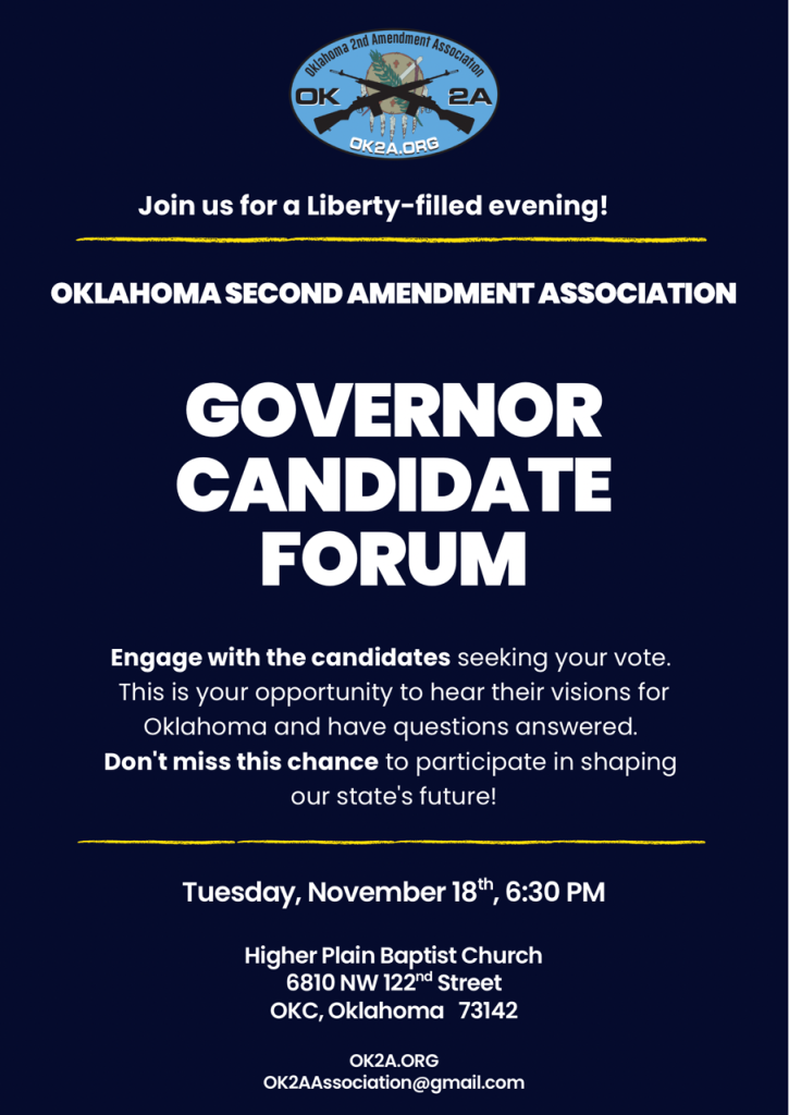 Put Tuesday, November 18th at 6:30 PM on your calendar to see and hear candidates for the 2026 Gubernatorial election. Location: Higher Plain Baptist Church.